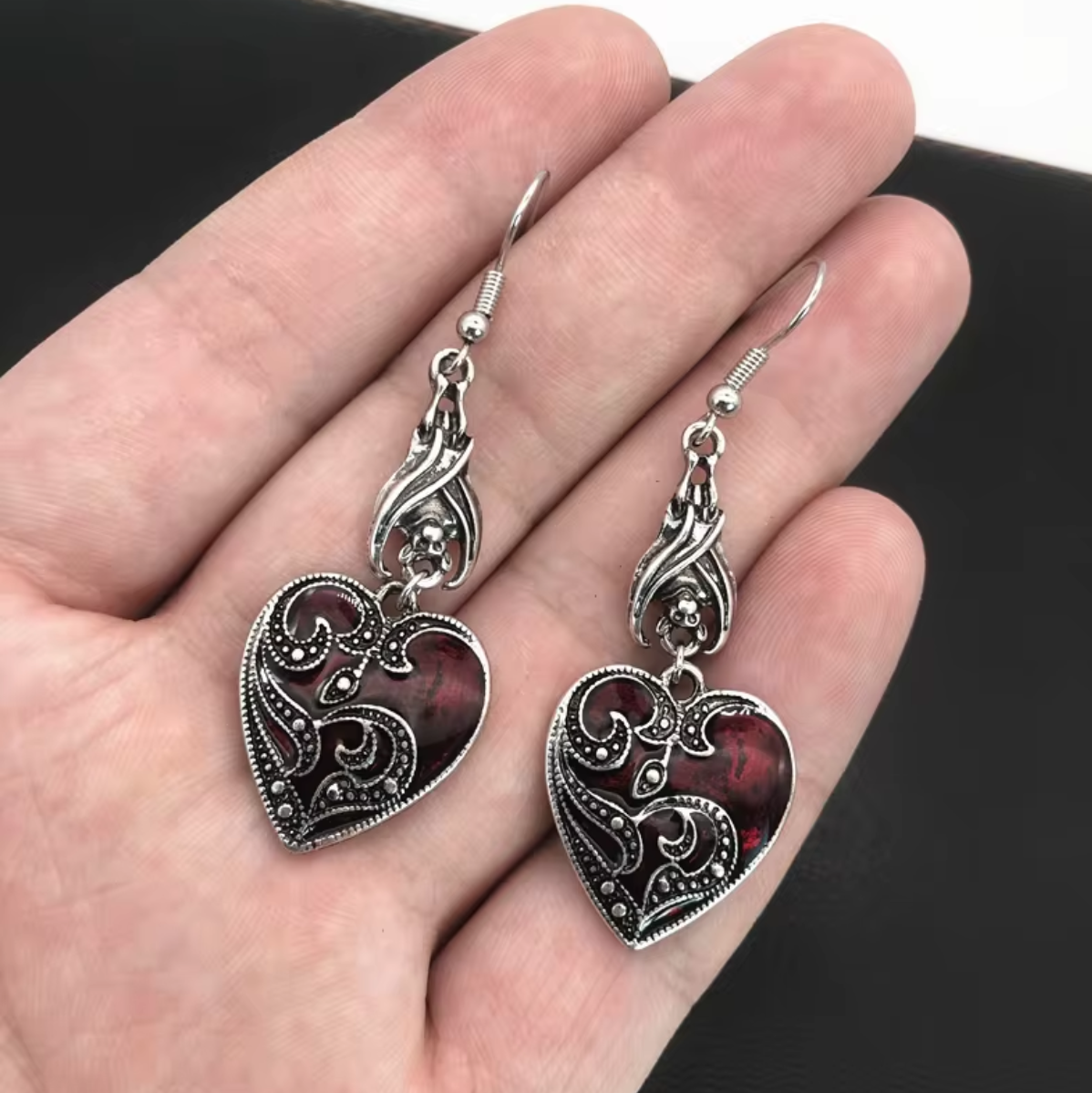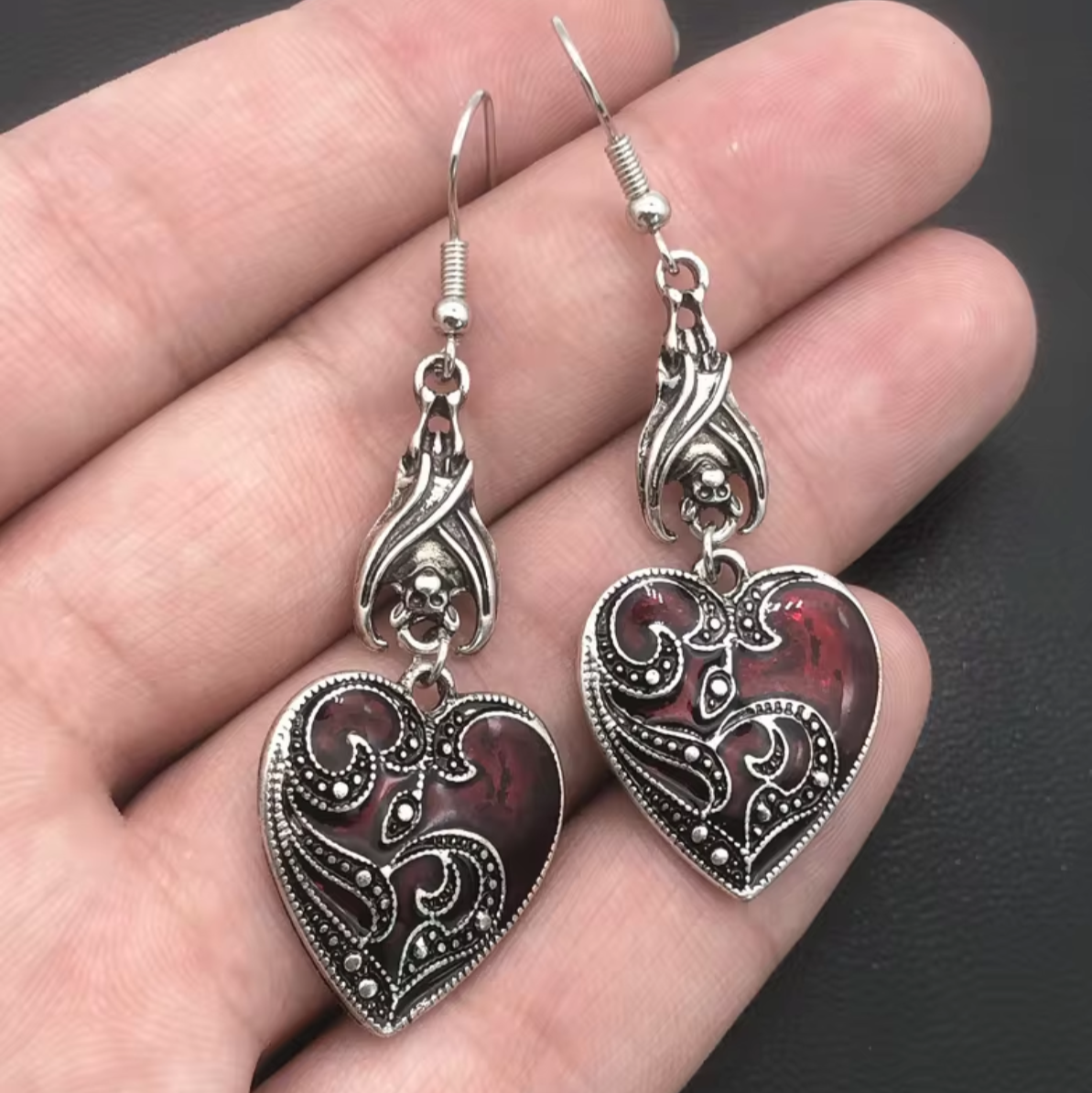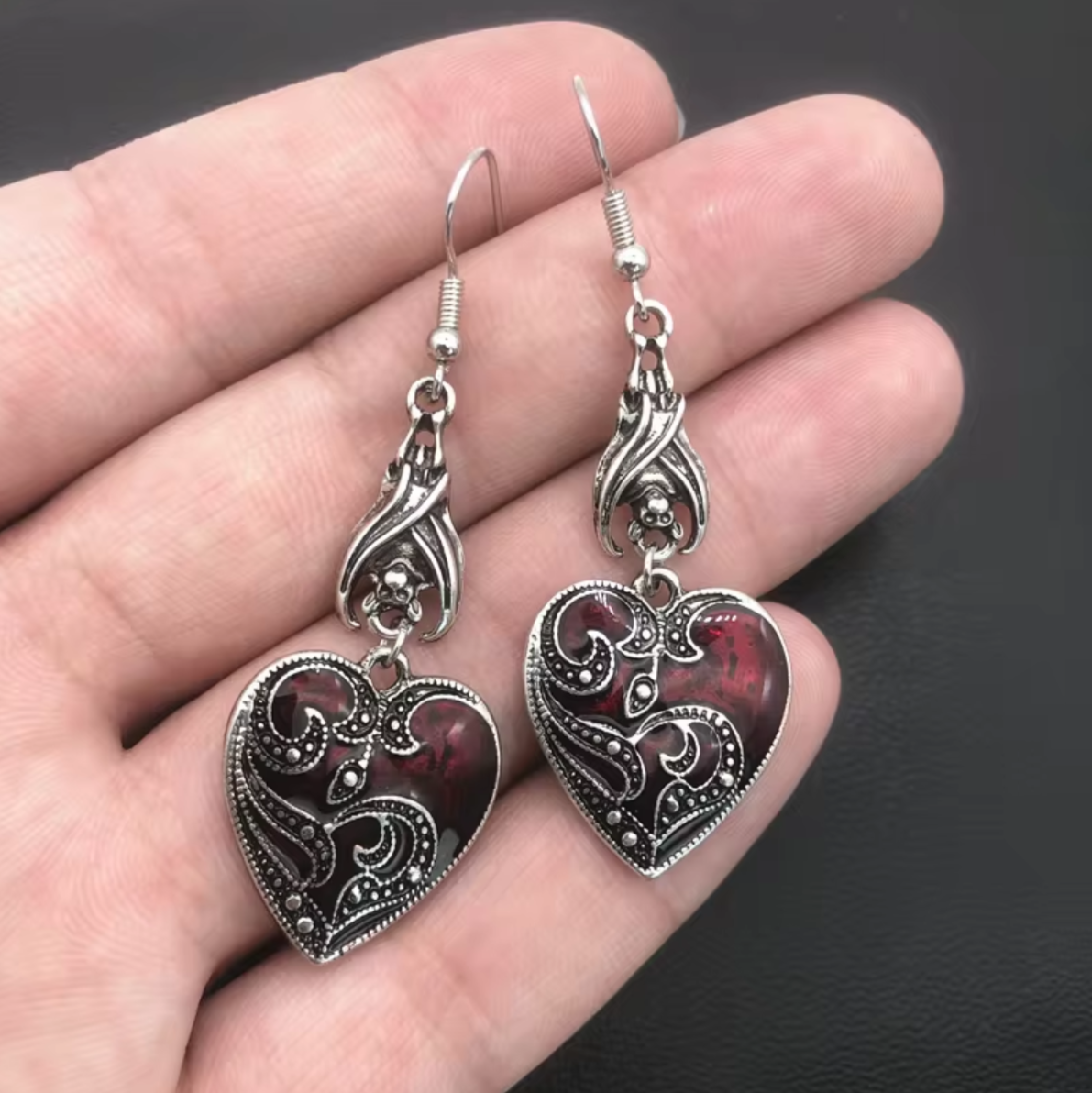 Gdzie mrok spotyka się z miłością, a siła z czułością. Te wyjątkowe wiszące kolczyki to połączenie gotyckiej tajemniczości z uniwersalnym symbolem miłości. Nietoperze, strażnicy nocy, delikatnie unoszące czerwone serca, tworzą metaforę ochrony i oddania – niczym wampirza miłość, która trwa przez wieki.