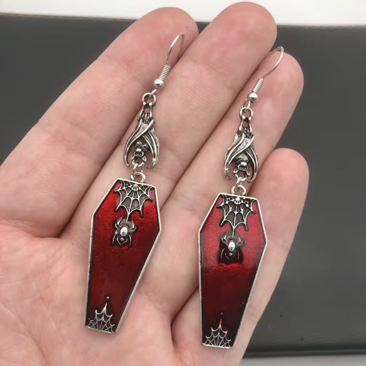 "Nocny Pogrzeb" – Wiszące Kolczyki Trumny z Nietoperzami