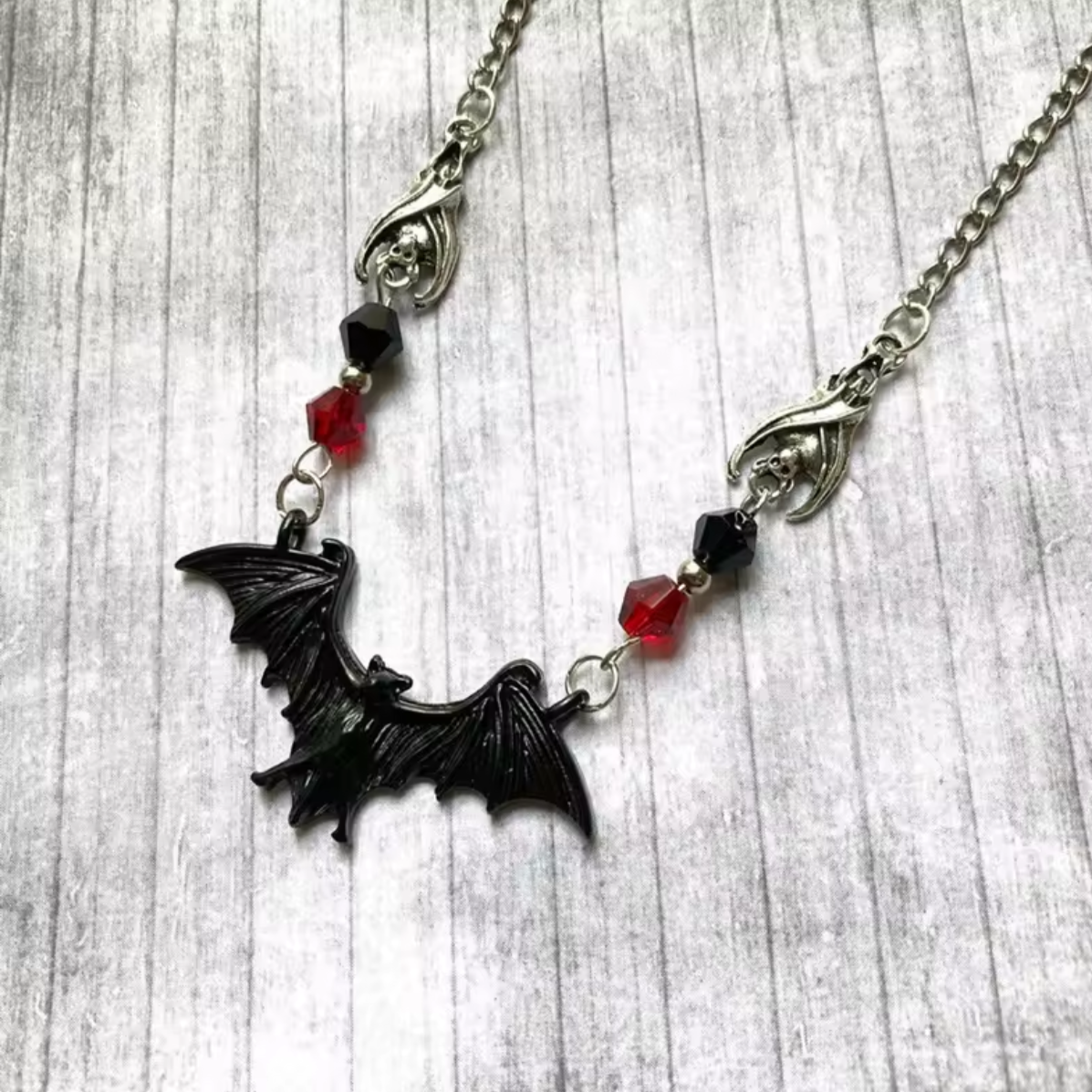 "Szkarłatna Noc" – Naszyjnik z Czarnym Nietoperzem, Łańcuszkiem i Czerwonymi Koralikami