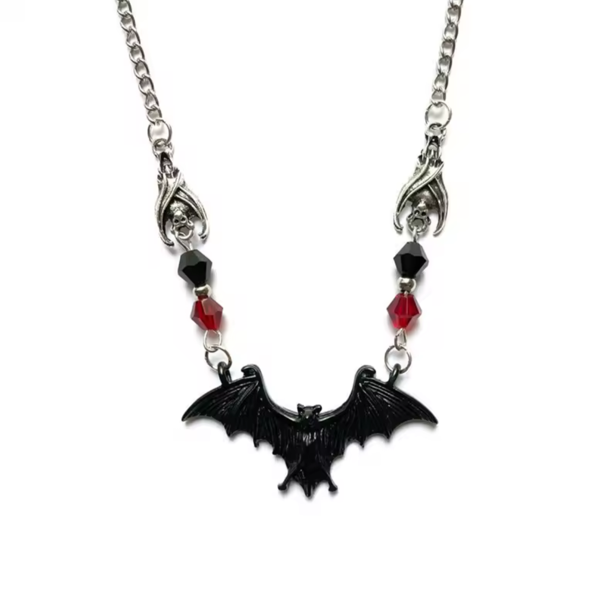 Niech mrok zabłyśnie szkarłatem! Ten wyjątkowy naszyjnik to doskonałe połączenie gotyckiej tajemniczości z odważnym, intensywnym akcentem. Czarny nietoperz, spowity czerwonymi koralikami na finezyjnym łańcuszku, tworzy kompozycję pełną kontrastu i magii.