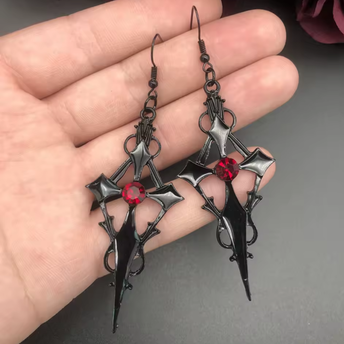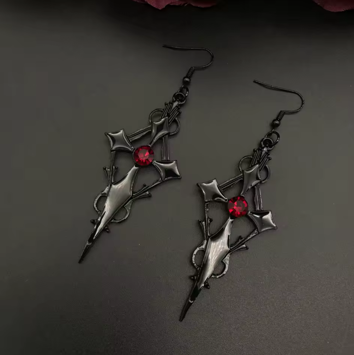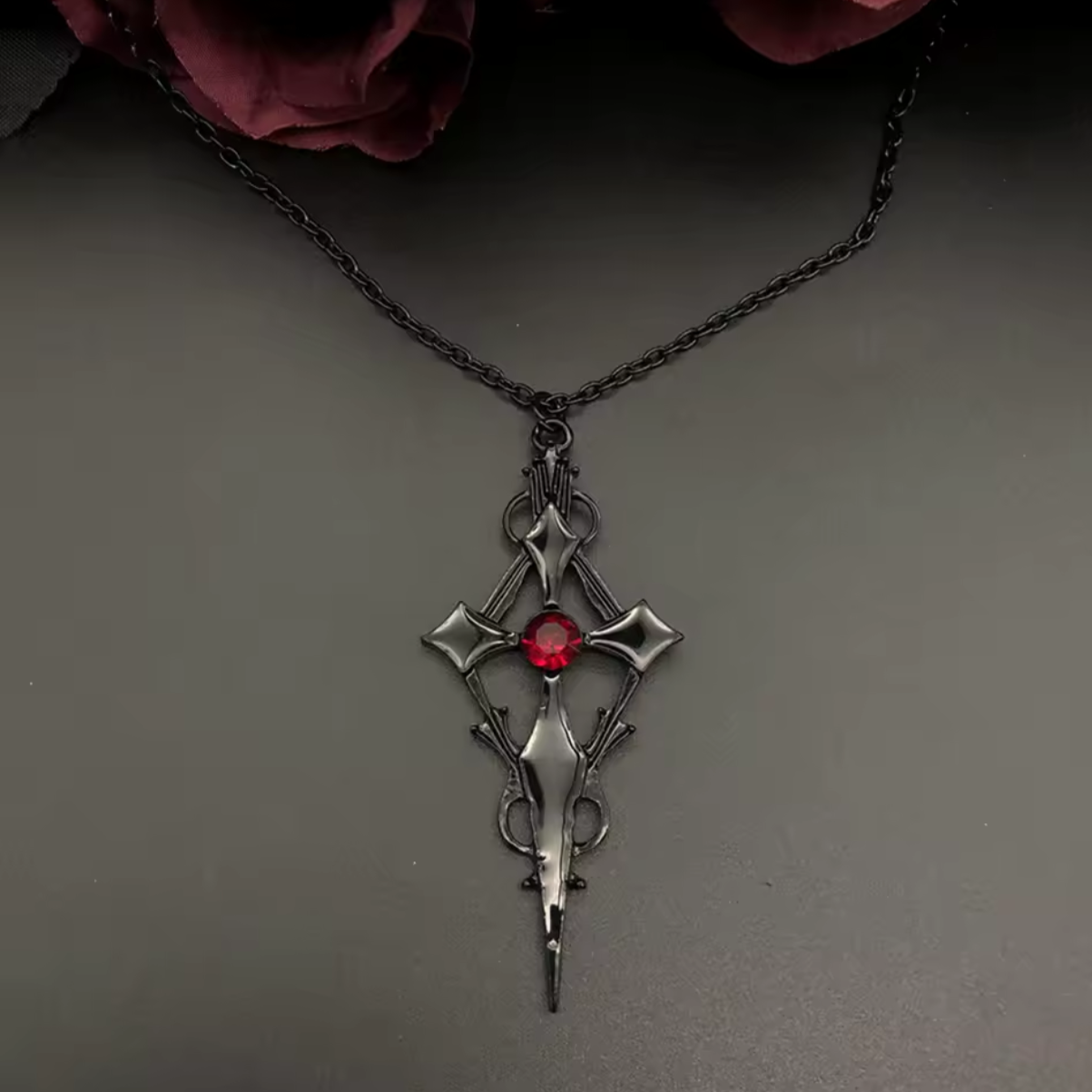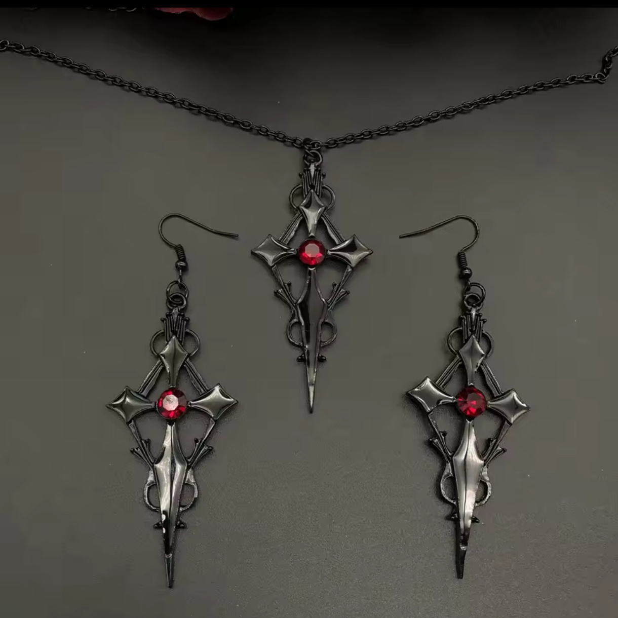 Odkryj moc kontrastu, gdzie czerń spotyka się z szkarłatem! Ten wyjątkowy zestaw gotyckiej biżuterii to połączenie mrocznej elegancji z odważnym, intensywnym akcentem. Naszyjnik i kolczyki zostały zaprojektowane tak, by podkreślić Twoją siłę charakteru i dodać nuty tajemniczości każdej stylizacji.